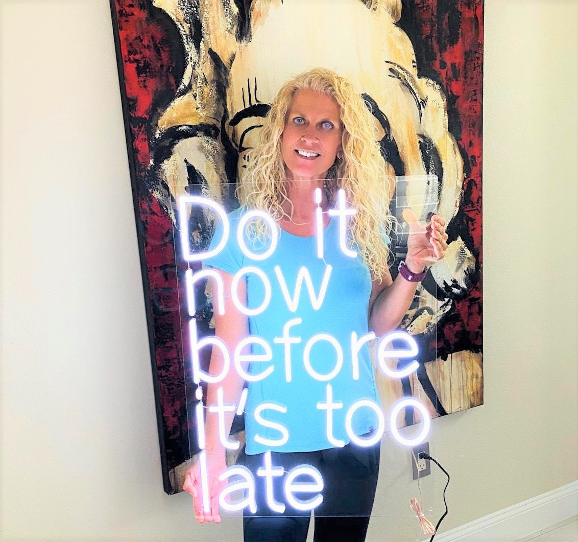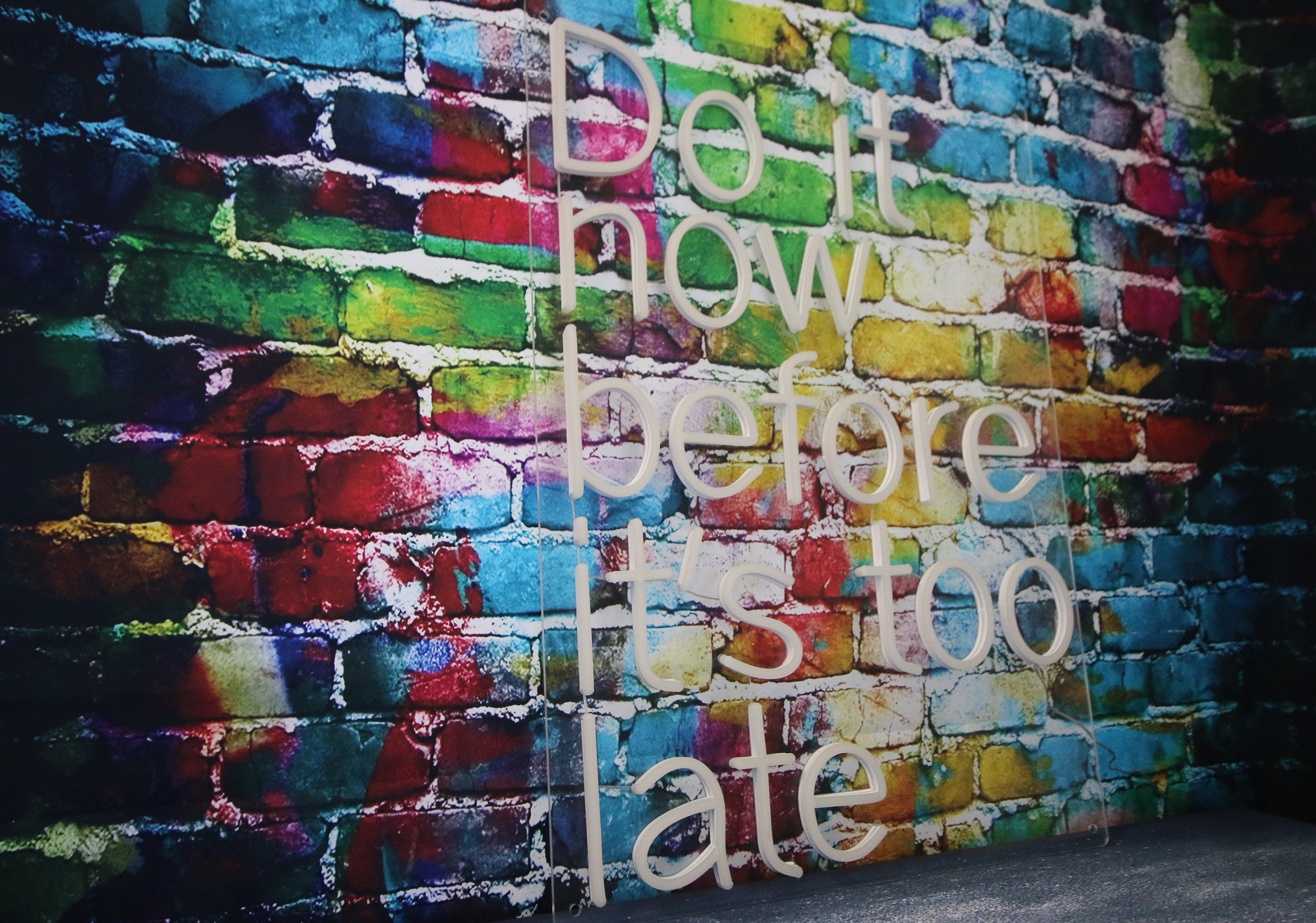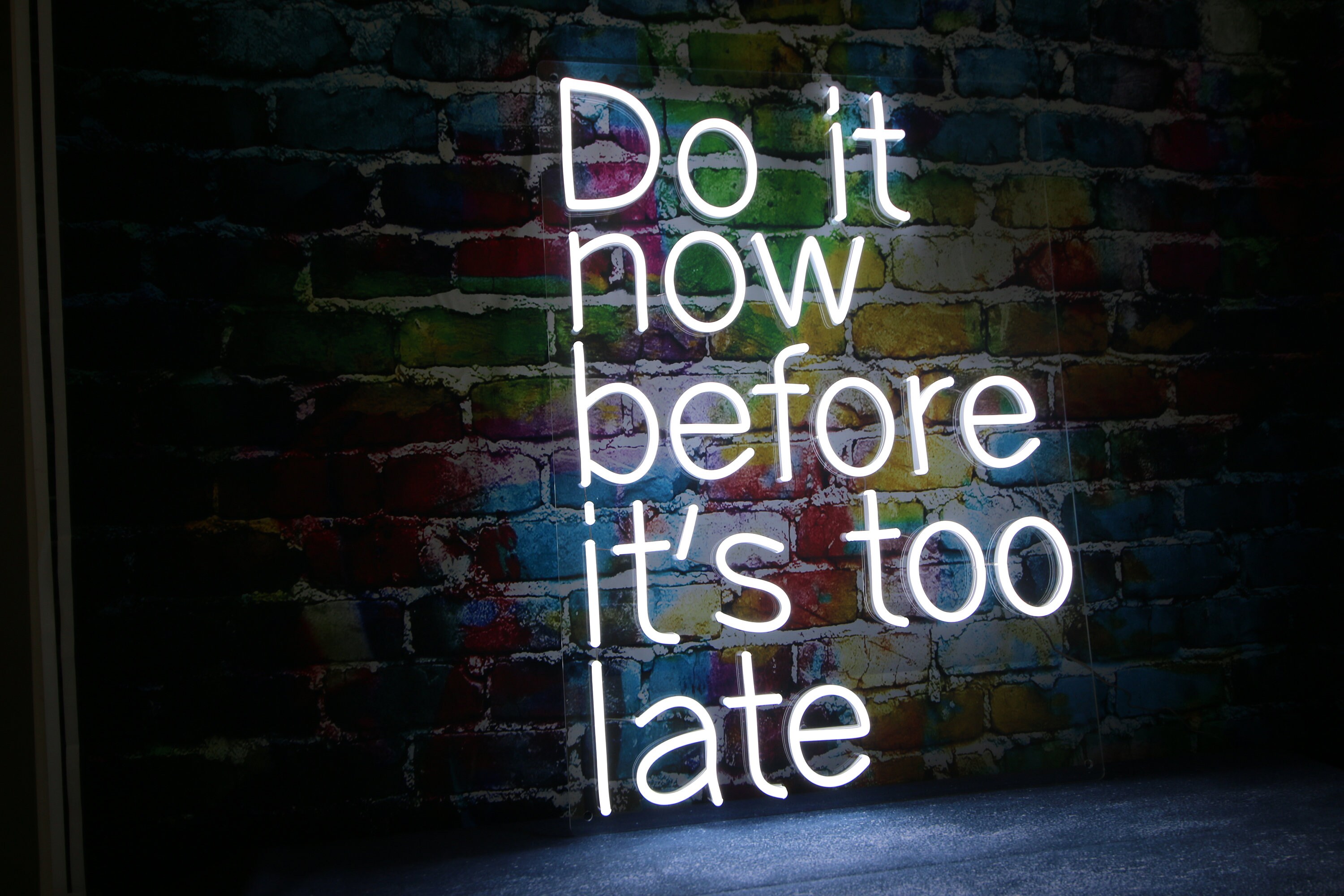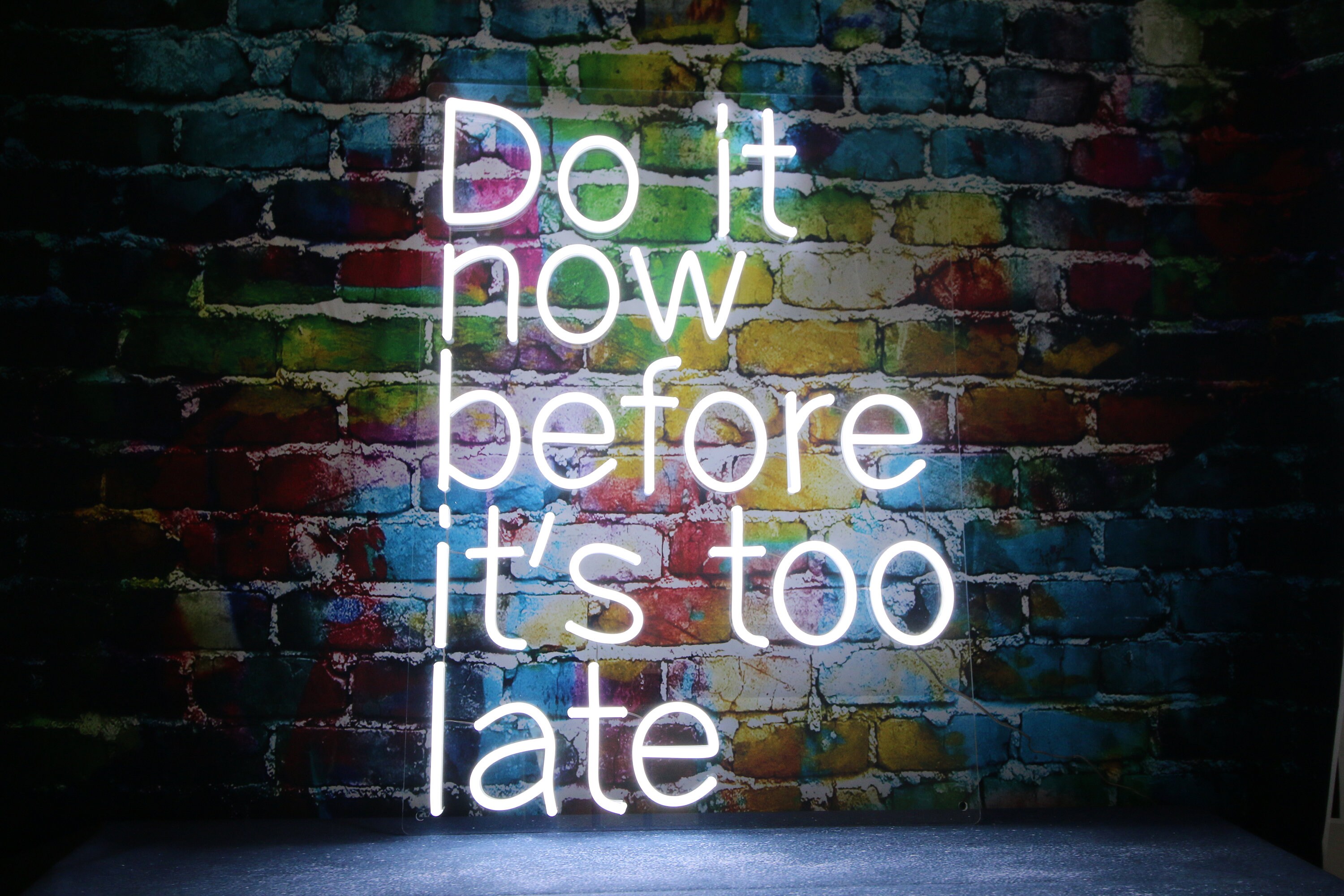 Bright White LED neon "Do it now before it's too late" sign on clear acrylic cut out. Dimensions are 31" x 23".